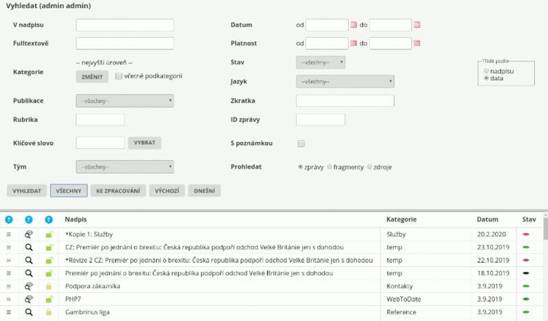 Výběr zpráv pro vložení do textu akce