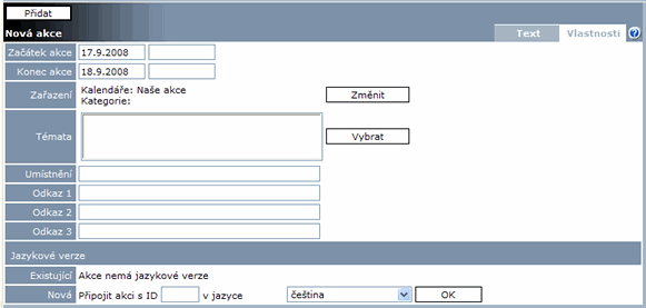 Založení nové akce v kalendáři akcí, záložka Vlastnosti