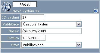 | 11. 8. 2009, 12:14 | 332 × 177 (7 KB) | Bajkvl (diskuse | příspěvky) | Category:WebToDate 4.1 Publikace a vvydání Publikace a vvydání - přidání nové publikace |