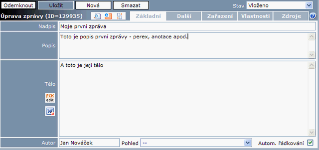 Redaktorská - úprava zprávy, tlačítko Uložit