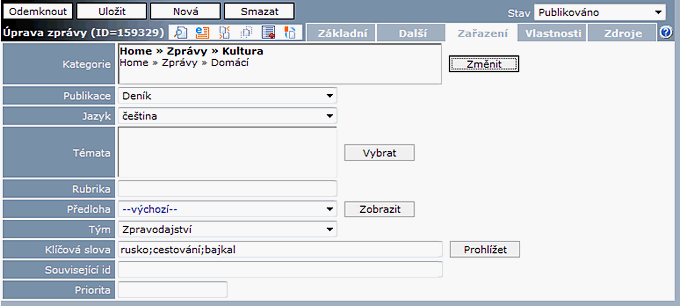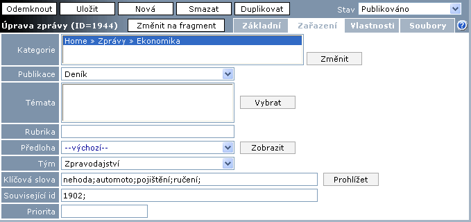 Referenční - Zprávy, záložka Zařazení