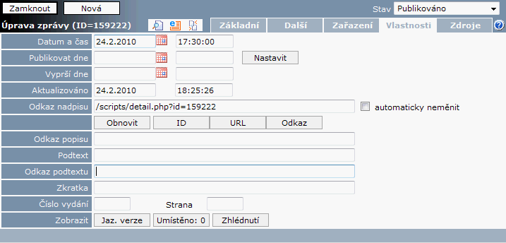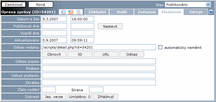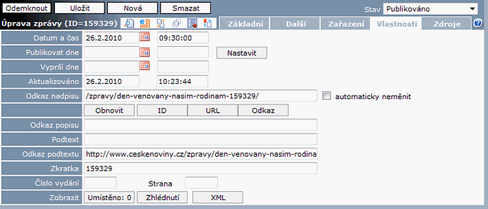 Referenční - Zprávy, záložka Vlastnosti