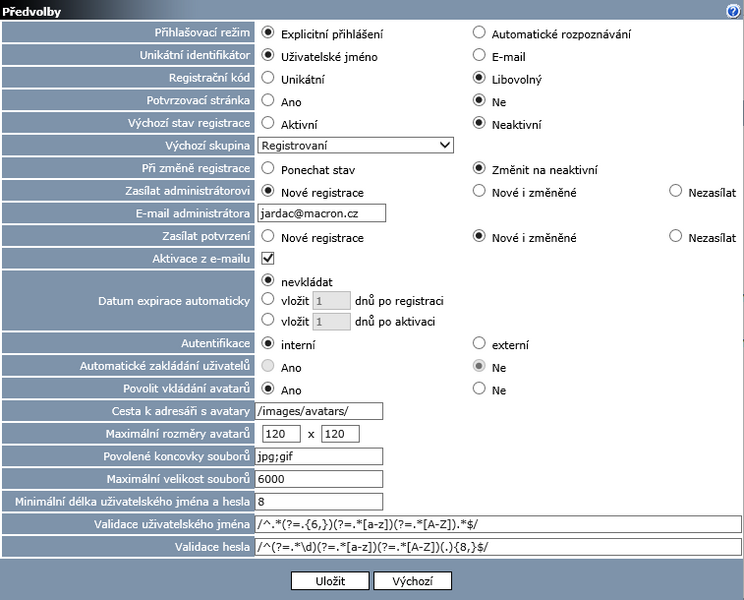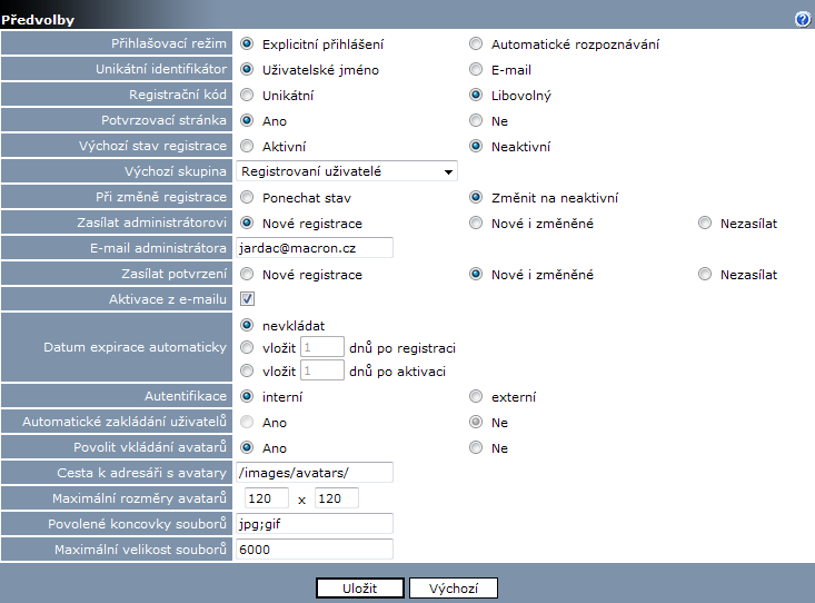 Registrace a personalizace - nastavení předvoleb modulu