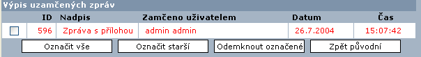 | 14. 8. 2009, 10:58 | 604 × 82 (5 KB) | Bajkvl (diskuse | příspěvky) | Category:WebToDate 4.1 Verifikace Verifikace - výpis uzamčených zpráv |