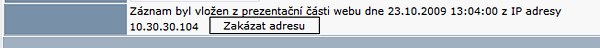 Základním nástrojem pro správu seznamu zakázaných adres je funkce Data - Zakázané IP adresy modulu. Zde lze běžným způsobem editovat seznam adres, lze zadávat pouze kompletní adresy, není podporována nějaká hvězdičková konvence. Druhou možností je přímo z editačního formuláře pro záznamy použít tlačítko Zakázat adresu.