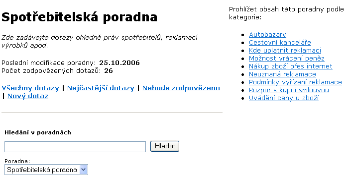 • Výchozí stránka poradny zobrazuje základní informace o poradně a obsahuje odkazy na výpisy dotazů v poradně a vkládání nových dotazů
