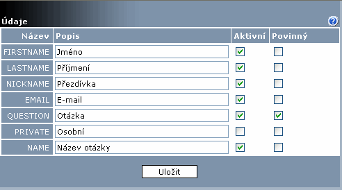 Nyní přejděte do nabídky AdministraceÚdaje. V tomto formuláři se volí, která pole budou přístupná v formulářích pro vkládání nových dotazů a která z nich budou vyžadovat povinné vyplnění.