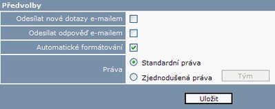 Pro tuto chvíli vypněte obě funkce pro odesílání e-mailů, volbu Automatické formátování je možné ponechat, stejně tak ponechte volbu Standardní práva.