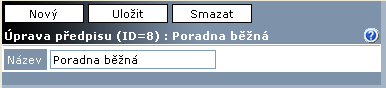 V tomto formuláři se zadává pouze název předpisu. Předpis je souhrn grafických a funkčních nastavení, který definuje chování a vzhled dané části modulu, v tomto případě dané poradny. Pojmenujte proto předpis podle zamýšleného způsobu užití.