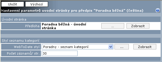 Posledním krokem je příslušné nastavení pro připravovanou úvodní stránku poradny. Přejděte do nabídky modulu NastaveníPředpisy – název předpisu – Úvodní stránka. Formulář vyplňte dle následujícího otisku obrazovky, nastavení Styl seznamu kategorií můžete zvolit libovolné, protože v tuto chvíli poradna žádné kategorie nemá a jejich seznam se na stránku nevkládá.