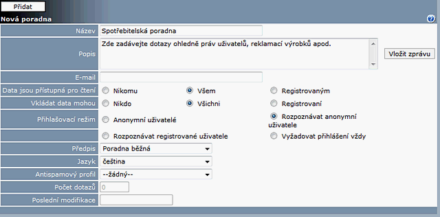 Přejděte do nabídky AdministracePoradny. Pomocí odkazu Přidat v pravém horním rohu okna prohlížeče založte první poradnu. Formulář vyplňte dle následujícího vzoru a uložte.