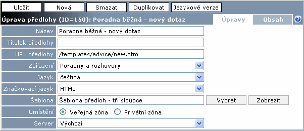 Nyní založíme předlohu pro stránku pro vkládání dotazů. V hlavní nabídce WebToDate použijte VzhledPředlohy, klepněte na ikonu složky vedle názvu Poradny a rozhovory a použijte odkaz Přidat v pravém horním rohu. Formulář pro založení předlohy vyplňte dle následujícího vzoru. Jako šablonu použijte vhodnou stránku, která má oblast, na kterou bude možné vložit fragment s formulářem založený v prvním kroku.