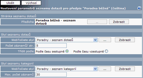 Nyní je třeba v modulu provést příslušné nastavení pro stránku zobrazující seznam dotazů v poradně. Přejděte do nabídky modulu NastaveníPředpisy – název předpisu – Seznam dotazů. Formulář vyplňte dle následujícího otisku obrazovky, nastavení Styl seznamu kategorií můžete zvolit libovolné, protože v tuto chvíli poradna žádné kategorie nemá a jejich seznam se na stránku nevkládá.