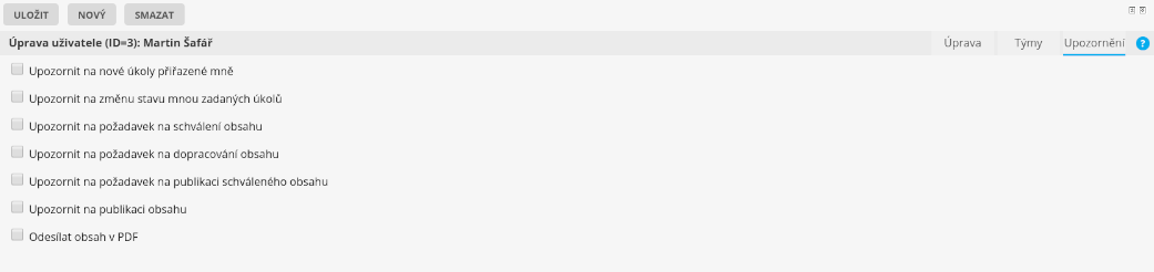 - V profilu uživatele (Administrace - Uživatelé) se nastavuje, jaká pravidla platí pro uživatele z hlediska úkolování a jaké typy oznámení e-mailem případně dostává.