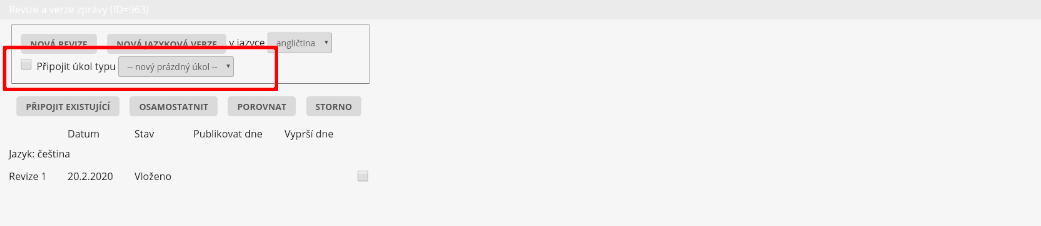 Ve formuláři pro práci s revizemi a verzemi je možnost při zakládání nové revize či verze zvolit, že ke zprávě má být založen nový úkol a eventuálně zvolit jeho šablonu. V takovém případě uživatel přechází na formulář úkolu, který je případně předvyplněn dle zvolené šablony. Úkol v takovém stavu ještě není uložen do databáze. Po jeho uložení má uživatel možnost tlačítkem ve formuláři úkolu přejít zpět na zprávu.