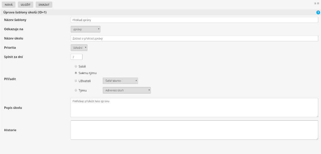 Definované šablony se pak uplatní při zakládání nového úkolu:
