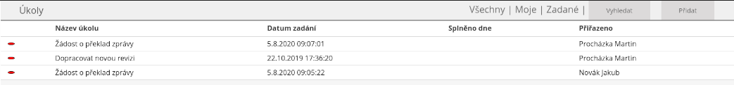 - Všechny – zobrazí všechny úkoly relevantní k přihlášenému uživateli resp. všechny pro administrátory. Relevantní jsou ty, které uživatel zadal a ty, které na něj směřují.