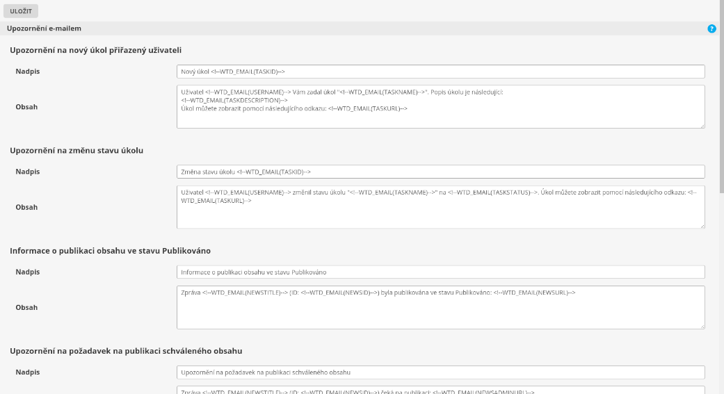 E-maily mohou upozorňovat na nové úkoly nebo na změny stavu úkolů. V nabídce Administrace - E-maily se definuje obsah těchto e-mailů. pro každý typ e-mailu se definuje nadpis a obsah: