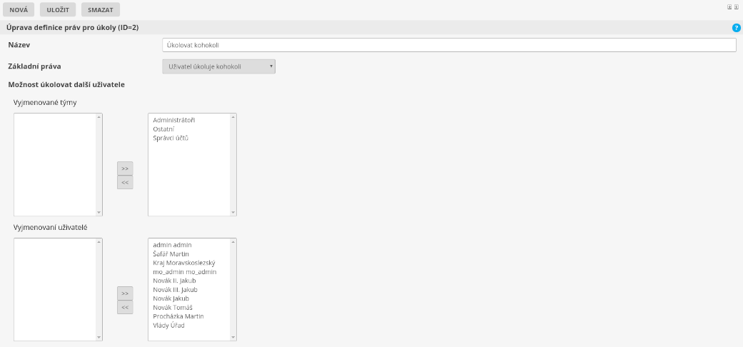 - Možnost úkolovat další uživatele - lze zde konkrétně specifikovat, které týmy či uživatele může kromě základního nastavení uživatel úkolovat.