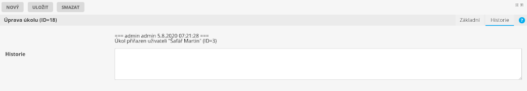 V záložce Historie lze k úkolu připisovat poznámky informující např. o postupu plnění úkolu. Do historie lze text pouze přidávat, aktuální stav se zobrazuje v horním poli, nový text se přidává přes spodní pole. Přidané texty obsahují automaticky hlavičku se jménem uživatele a časovým údajem.