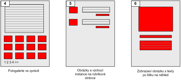 - Ve stránce se zprávou se má zobrazit fotogalerie, která je případně i stránkovaná. Designově lze toto pojmout různým způsobem, buď např. pod tělem zprávy rovnou zobrazit fotogalerii formou mozaiky náhledů, nebo zobrazit tu samou zprávu v jiné předloze, která obsahuje fotogalerii ale ne třeba tělo zprávy, nebo vytvářet samostatné zprávy, jejichž účelem je pouze prezentace nějaké fotogalerie.