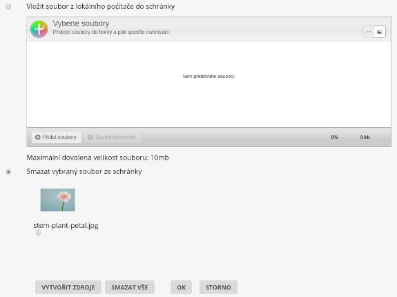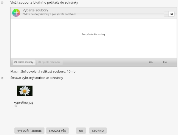 Soubory lze do zdroje vložit buď z lokálního disku, nebo z uživatelské schránky. Pokud máte soubor na svém lokálním disku, vyberte jej pomocí volby Vložit soubor z lokálního počítače. Soubory přetahujte do části dialogu pr nahrávání myší nebo použijte tlačítko Přidat soubory, následně spusťte nahrávání na server tlačítkem Spustit nahrávání.