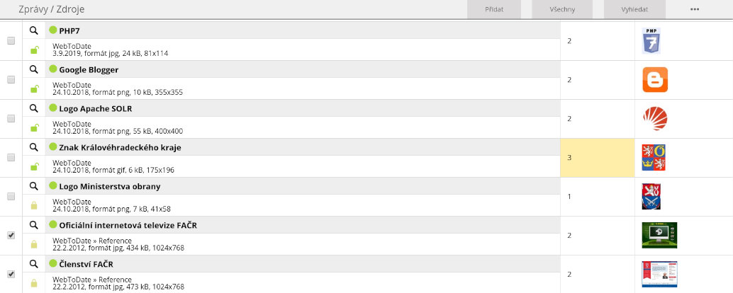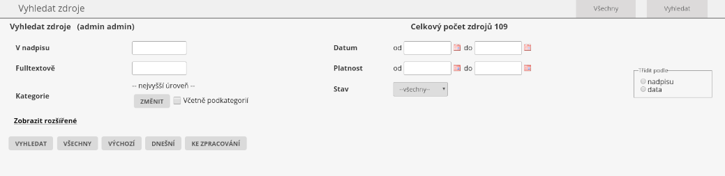 Vyvolejte seznam zdrojů (buď v hlavní nabídce Obsah – Zdroje, nebo funkcí Zdroje ze stromu kategorií). V pravé horní části okna se zobrazí seznam podle následujícího otisku obrazovky.