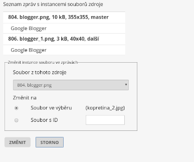 Ve druhém kroku se přejde do formuláře pro úpravu zdroje, kde se nachází soubor, který je aktuálně připojen k nějakým zprávám, a instance ukazující na tento soubor chceme přesměrovat na jiný vybraný v předchozím kroku. Zde se použije tlačítko Užití, zobrazí se následující dialogové okno.