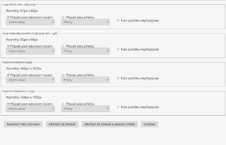 - Přiřazovat tyto záznamy ke zprávám tak, aby bylo možno zobrazit seznam přiřazených položek (např. seznam odkazů na PDF soubory) včetně omezení na určité typy (odděleně seznam PDF, MS Word souborů apod.). Jeden soubor může být použit vícekrát.