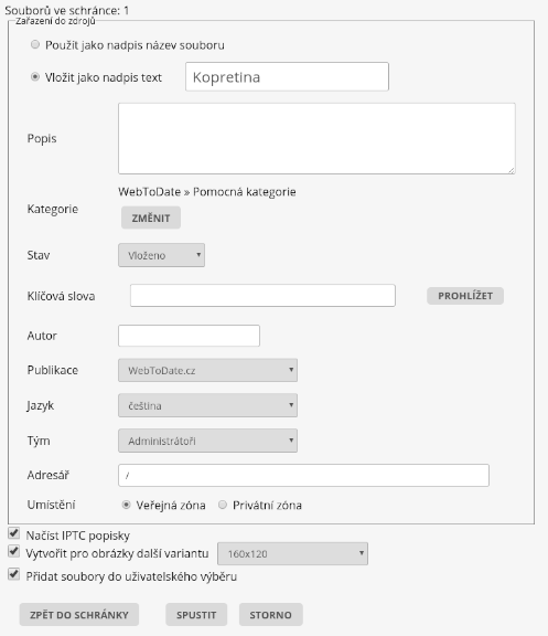 - Umístění – volí se veřejná či privátní zóna. Tato volba nemusí být k dispozici, záleží na nastavení chování databáze zdrojů v globálních předvolbách WebToDate.