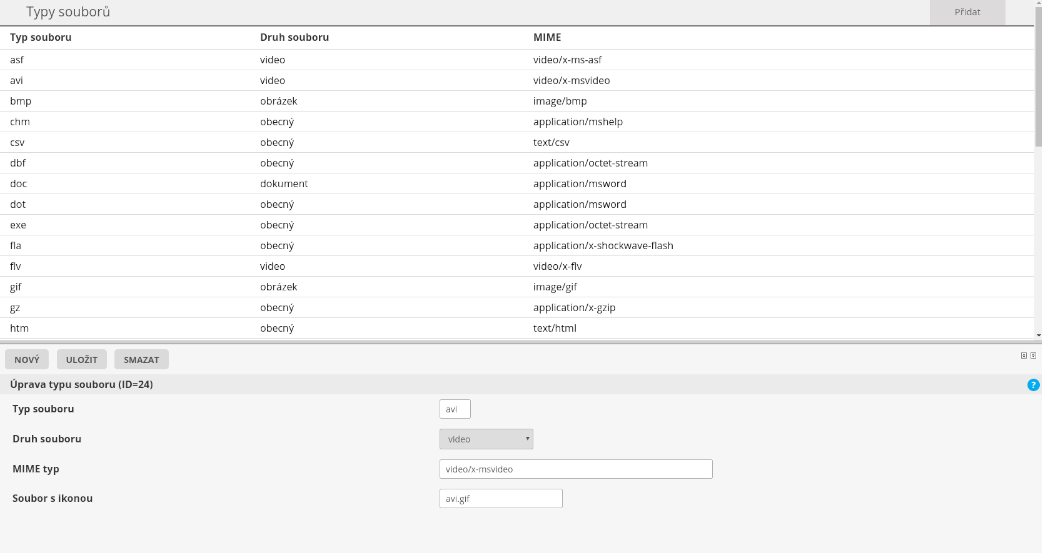 Změny nastavení lze provádět pomocí funkce Administrace - Typy souborů. Po vyvolání této funkce se zobrazí v pravém horním rámci prohlížeče seznam typů daných koncovkami, po klepnutí na název koncovky lze měnit nastavení pro daný typ souboru.