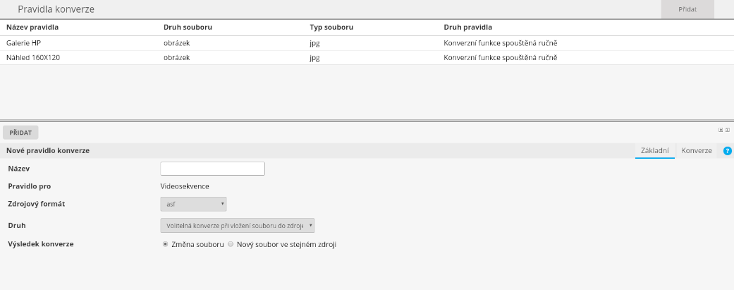 - Druh souboru - volba obecný / obrázek / video / audio. Pro typ obrázek se vytvářejí náhledy, nabízí se konverzní funkce a možnost úprav přes funkci pro zpracování obrázků. Pro typ video se vytvářejí náhledy a nabízí se konverzní funkce. Pro typ obecný nejsou k dispozici žádné speciální funkce a v seznamu zdrojů se takové soubory prezentují ikonou a nikoli náhledem.