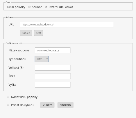 Změnou radiopřepínač Druh položky na Externí URL odkaz lze místo souboru do zdroje vložit odkaz. Dialogové okno se změní dle následujícího otisku obrazovky.