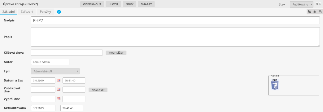 Formulář pro vkládání zdrojů se skládá ze tří záložek – Základní – Zařazení – Položky. Záložka Položky je pro nový zdroj nepřístupná a zobrazí se až po prvním uložení, to znamená, že položky lze do zdrojů vkládat až když je zdroj vytvořen.