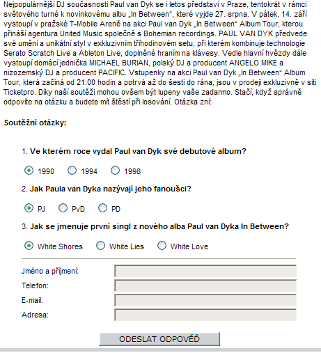 - Návštěvník webu se na určité adrese může zúčastnit soutěže spočívající ve volbě odpovědí z předpřipravených možností na sadu otázek. Seznam otázek a odpovědí se prezentuje jako formulář, kde na jednotlivé otázky se vybírá odpověď typicky formou radiopřepínačů s odpověďmi.