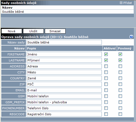 Položkou Osobní údaje nabídky se definují pojmenované sady osobních údajů, které pak jsou používány soutěžemi, neboli vybírají se ve formuláři Probíhající soutěž předpisu.