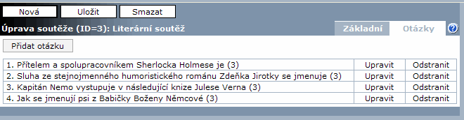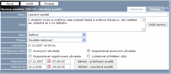 - Vytvořeno - datum založení soutěže pouze pro čtení