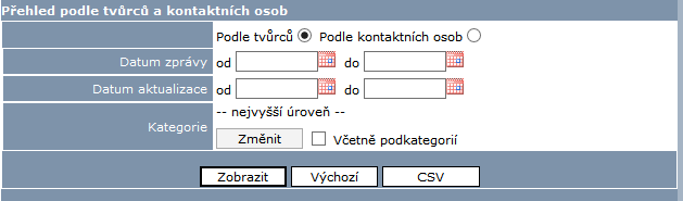 V horním rámci se zadávají parametry sestavy - zda se vypisují tvůrci nebo kontaktní osoby, časový rozsah zpráv a kategorie. Sestavu lze zobrazit nebo exportovat ve formátu CSV.