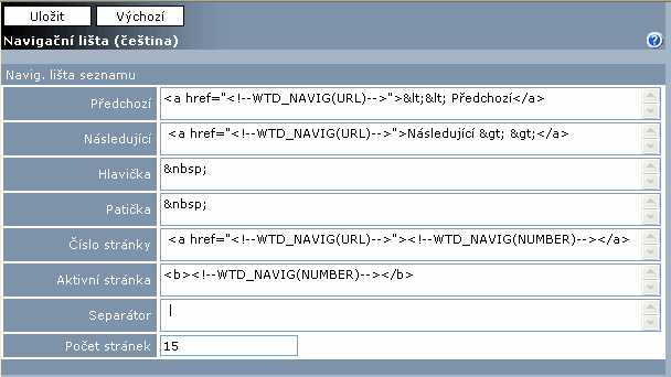 Pro správnou funkci navigační lišty je nutné do výše popsaných polí zadávat i klíčová slova <!--WTD_NAVIG(URL)--> a <!--WTD_NAVIG(NUMBER)-->.