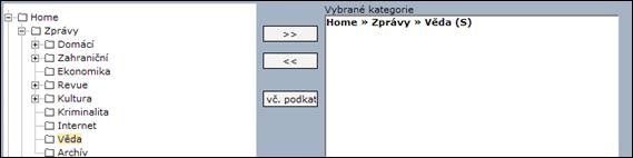 - Kategorie – pomocí tlačítka Změnit zobrazte dialog pro výběr kategorií. Klepněte vlevo na vámi zvolenou kategorii, pomocí tlačítka >> ji vložte do seznamu Vybrané kategorie a pomocí tlačítka vč.podkat. nastavte, že se tato kategorie má exportovat včetně podkategorií (za názvem kategorie se objeví písmeno S).