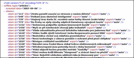 Druhým krokem je automatické sestavení seznamů položek k exportu. Modul na základě nadefinovaného pravidla sestaví několik XML souborů s jednoduchou strukturou, které obsahují seznam zpráv, zdrojů a stránek k exportu.