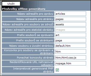 Po instalaci nastavte předvolby modulu v nabídce Administrace – Předvolby. Ponechejte výchozí hodnoty, pouze do pole Neidentifikovaná URL nahrazovat odkazem zapište název stránky, které se bude zobrazovat po klepnutí na odkaz, který při exportu nebyl nahrazen odkazem na nějakou exportovanou stránku (např. "nopage.htm"). Formulář uložte.