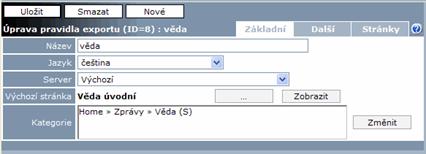 Vyvolejte funkci Administrace – Pravidla exportu. Odkazem Přidat vyvolejte formulář pro vytvoření nového pravidla. V první záložce formuláře Základní zadejte nějaký název pravidla. Zvolte si nějakou kategorii WebToDate k exportu a vyplňte následující pole: