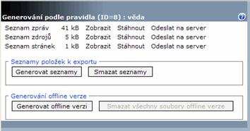 Přejděte do nabídky Administrace – Export a klepněte na název pravidla. Ve formuláři klepněte na tlačítko Generovat seznam. V pravém spodním rámci se zobrazí průběh sestavování seznamů. Po doběhnutí procesu bude mít formulář následující tvar, tj. aktivuje se tlačítko Generovat offline verzi.